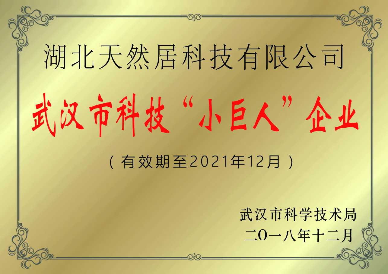 熱烈祝賀湖北天然居科技有限公司榮獲武漢市科技“小巨人”企業。榮獲此稱號也標志著武漢市科技局對湖北天然居科技有限公司作為高新技術企業的高度認可。