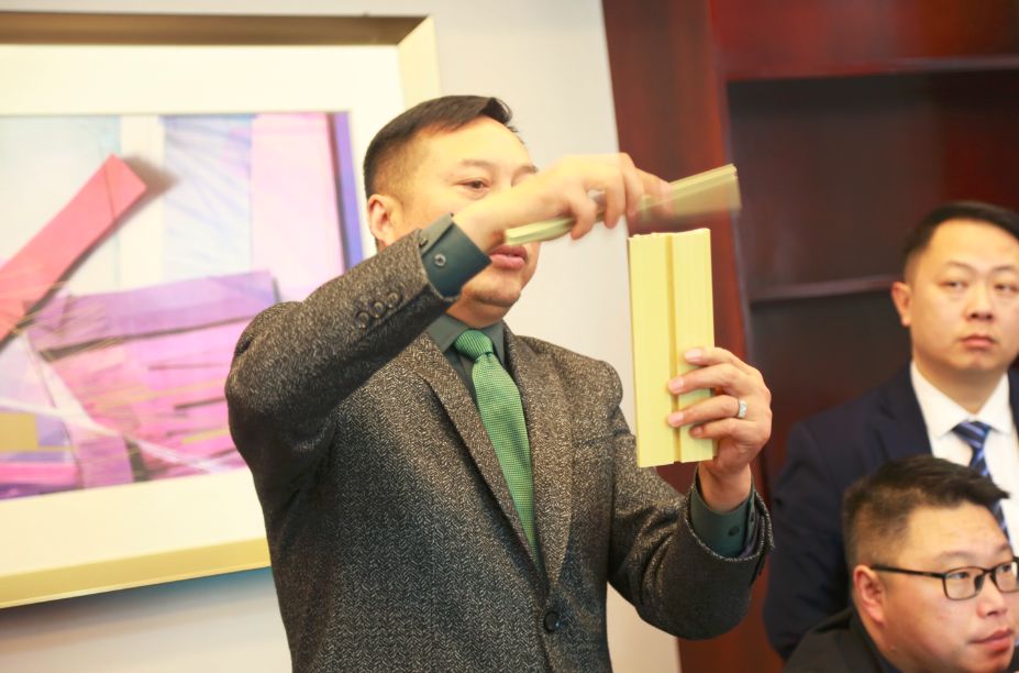 工程部總經(jīng)理潘倫飛現(xiàn)場(chǎng)講解新產(chǎn)品、新線條特點(diǎn)及應(yīng)用。潘總指出,2018年企業(yè)將在產(chǎn)品結(jié)構(gòu)、厚度、硬度、韌性等產(chǎn)品品質(zhì)上全新升級(jí),并同步新增幾十種主材及線條。會(huì)上,潘總現(xiàn)場(chǎng)4D演示新品的案例應(yīng)用、配色、軟裝,為進(jìn)一步幫助代理商掌握新產(chǎn)品核心施工要點(diǎn),更是現(xiàn)場(chǎng)上墻實(shí)操。