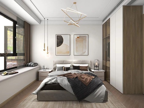 次臥比較溫馨,原木系衣柜,與木地板相配,床頭柜上臺燈,吊燈的設計,在暖光的直射下,讓臥室變得格外的溫馨。