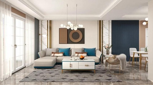 藍、橙、白三色勾勒的背景墻,很有層次感,時尚個性。一幅可以延伸室內(nèi)空間感的裝飾畫,引人遐想,同時也凸顯客廳的美感。